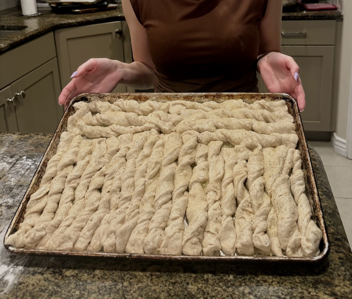 Cut into stips with a pizza cutter. Then place on the cookie sheet, rolling in the melted butter and then twisting.