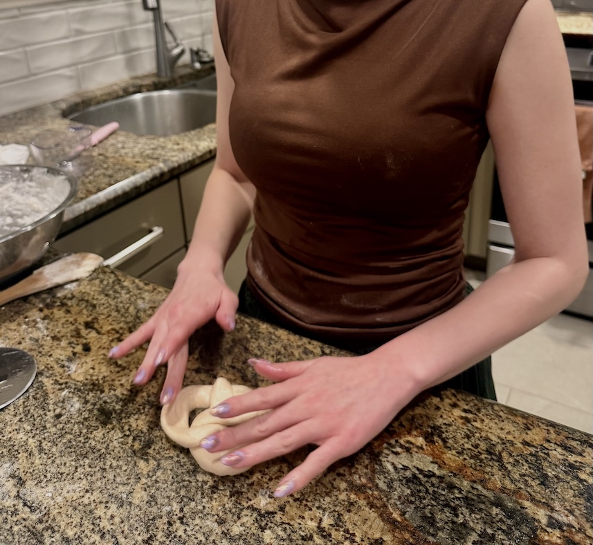 Cut the dough into strips approximately 1-1/2” wide and 8” long. Then, stretch and roll the dough strips until they are long, thin ropes. Shape the ropes into the classic pretzel shape.